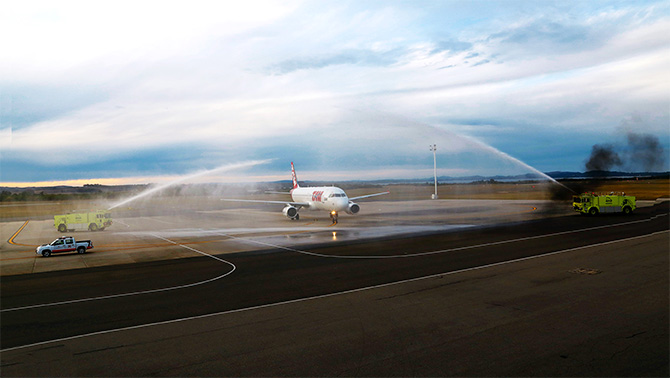 Ao chegar ao aeroporto de Laguna del Sauce, o voo foi recepcionado com o tradicional batismo da aeronave. Em seguida, convidados e autoridades comemoram a ocasião com um coquetel realizado nas instalações do resort Enjoy Conrad.