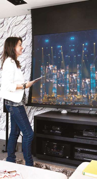 O telão (um projetor de alta resolução) e as caixas de som bookshelf e de forro são peças-chave para a reprodução perfeita de sons e imagens.