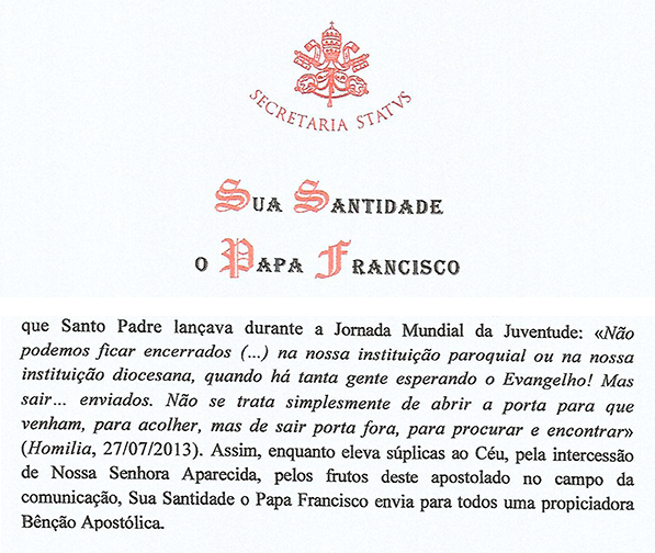 Padre Evaldo Sousa, diretor de produção da TV Aparecida, destaca a importância da mensagem e da bênção recebida. "Saber que estamos em comunhão com a Igreja, e que o Papa Francisco, por meio de sua Secretaria de Estado reconhece nossa força evangelizadora, nos faz ainda mais animados para seguir e missão de evangelizar pelos meios de comunicação".