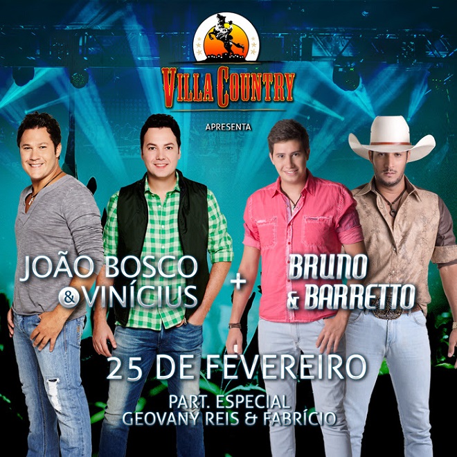 Grandes nomes da atual música sertaneja se apresentarão na Villa Country no dia 25 de fevereiro. João Bosco & Vinicius e Bruno & Barretto irão trazer a mistura do sertanejo tradicional, universitário e bruto para os palcos da maior casa temática sertaneja da América Latina. Além das duas atrações a apresentação contará com a participação especial da dupla Geovany Reis & Fabricio.