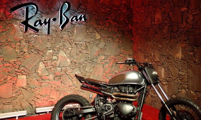 A decoração temática reuniu vários logos da marca de óculos com lâmpadas vermelhas, motos e balões na piscina.