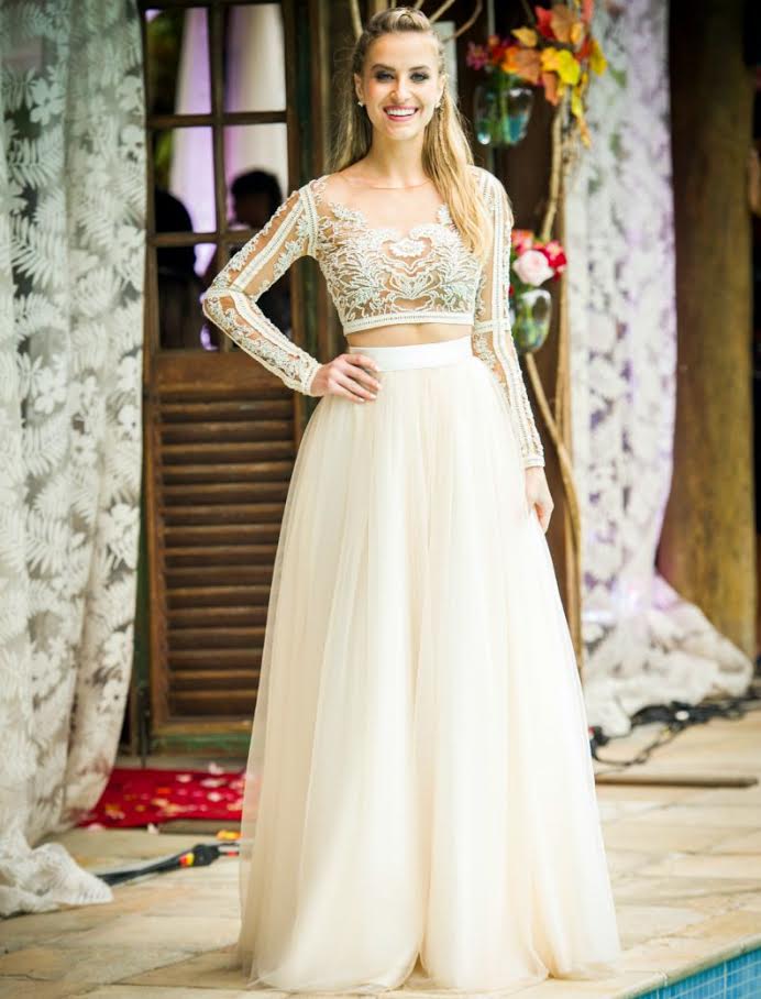 A atriz de malhação Barbara Franca, usou em seu casamento na novela um cropped e uma saia que chamaram muita atenção dos telespectadores e do mundo da moda também, por ele ser uma ideia bem diferente do vestido original. Esse é para as noivas modernas se expirarem.