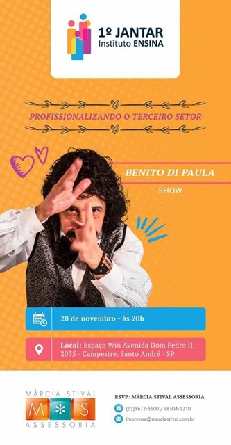 O Instituto Ensina fará no dia 28 de novembro, a partir das 20h, seu primeiro Jantar de Gala Beneficente, no sofisticado Espaço Win, localizado no ABC. O evento trará grandes atrações como Seadi, o humorista Rodrigo Capella, Rodrigo Sanches e o cantor Benito Di Paula, que ficará responsável pelo show da noite. O Instituto tem sede na cidade de Mauá e tem como missão contribuir com o direito à cidadania, cultura, esporte, saúde e lazer, assegurando através da profissionalização de organizações da sociedade civil.