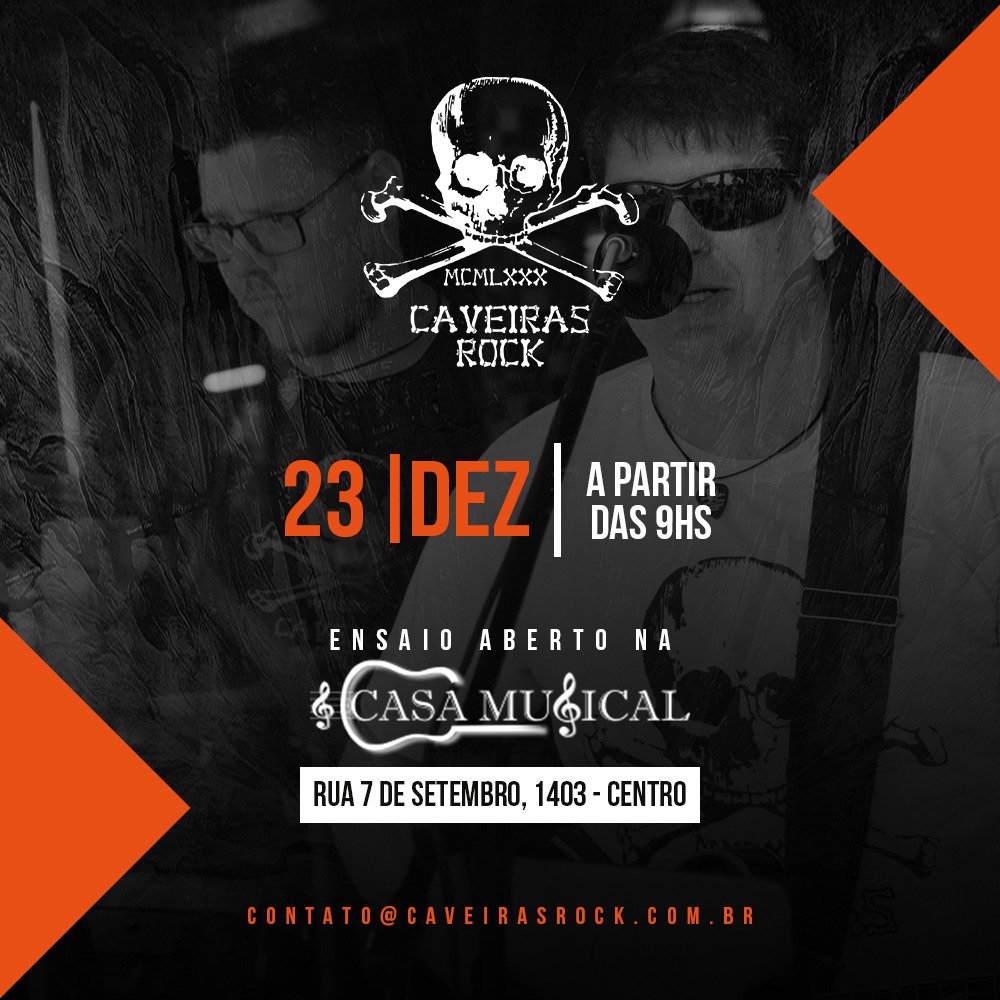 A banda Caveiras Rock fará um ensaio aberto ao público e convidados neste sábado, dia 23 de dezembro, à partir das 9 horas, na Casa Musical da cidade de Matão (SP). Segundo Rodrigo Pagliani, apresentador do Balanço Geral de Ribeirão Preto (SP) e vocalista dos Caveiras Rock, a banda vai tocar várias músicas do repertório.