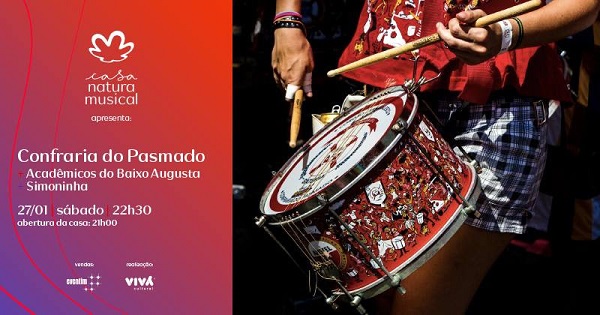 No sábado, 27 de janeiro, às 22h30, na Casa Natura Musical, a Confraria do Pasmado faz grande festa de aniversário de 15 anos, com sua bateria completa e tendo como convidados mais que especiais o bloco do Baixo Augusta com Simoninha, que abrem a noite, e a Festa Samambaia, com os DJs Paula ZG e Raphael Guedes.