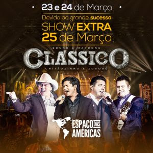 Os donos das vozes mais marcantes do Brasil, Chitãozinho & Xororó e Bruno & Marrone se apresentam lado a lado no show "Clássico", um encontro especial que acontecerá nos dias 23, 24 e 25 de março de 2018, no Espaço das Américas