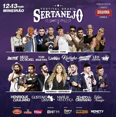 No primeiro dia, sábado, 12 de maio, as batidas do funk dominarão o evento com shows de Anitta, Nego do Borel, Kevinho, Livinho, Yuri Martins, além do tempero especial do baiano Léo Santana. Já no domingo, dia 13 de maio, a programação reunirá um time de artistas consagrados do tradicional sertanejo universitário. A sofrência tomará conta do Gigante da Pampulha quando Marília Mendonça cantar seus sucessos “Infiel” e “Transplante”. A emoção estará presente também quando Gusttavo Lima der voz ao hit “Apelido carinhoso”. Já Felipe Araújo e Henrique & Juliano cantarão a história da “mala que é falsa”, e só deixarão o palco quando os cantores Zé Neto e Cristiano estiverem “Largado às traças”.