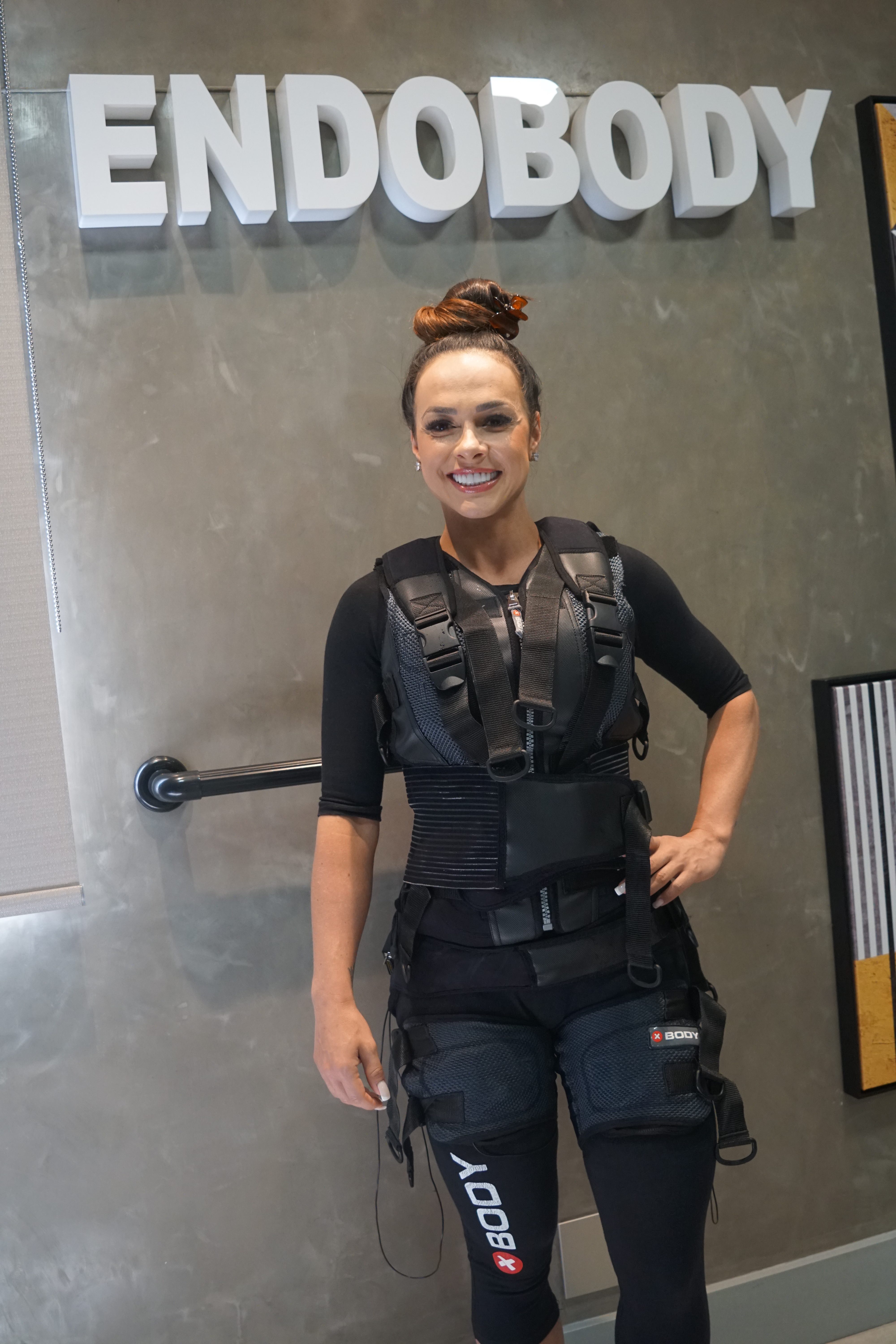 O procedimento para usar o XBody é relativamente simples, mas é feito com acompanhamento de profissionais especializados. Renata conta um pouco sobre o aparato utilizado: a gente usa um colete cheio desses eletrodos que fica ligado por fios ao dispositivo, além de uma roupa de lycra especial. Me sinto até meio a Viúva Negra com esta roupa (risos) Para utilizar o sistema, é necessário que haja um personal trainer habilitado, caso dos meus queridos Thiago e Luiza Guirra que preparam o treino para mim”.