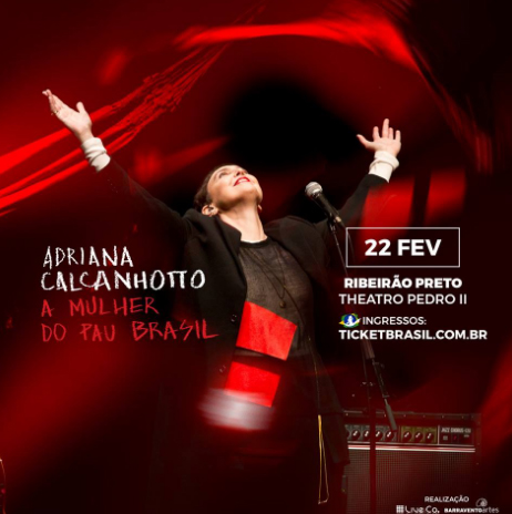 Após passar por diversas cidades da Europa e do Brasil, Adriana Calcanhoto vem a Ribeirão Preto com seu show "A mulher do Pau-Brasil", aclamado pela crítica especializada e com enorme sucesso de público. Acompanhada por Bem Gil e Bruno di Lullo, Adriana idealizou um roteiro com músicas novas, releituras (a recente ‘As Caravanas’, de Chico Buarque, por exemplo) e também reencontrando clássicos de seu repertório, como ‘Inverno’, ‘Vambora’ e ‘Esquadros’.