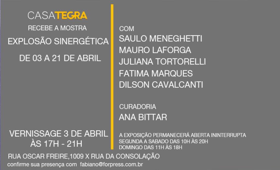 A galeria Casa Tegra recebe essa, que é uma exposição coletiva, com a produção de Chico Cortez, que leva ao público trabalhos dos artistas Saulo Meneghetti, Dilson Cavalcanti, Fátima Marques, Juliana Tornelli e Mauro Laforga, onde apresentam seus registros pictóricos sob a curadoria da artista e jornalista Ana Bittar.