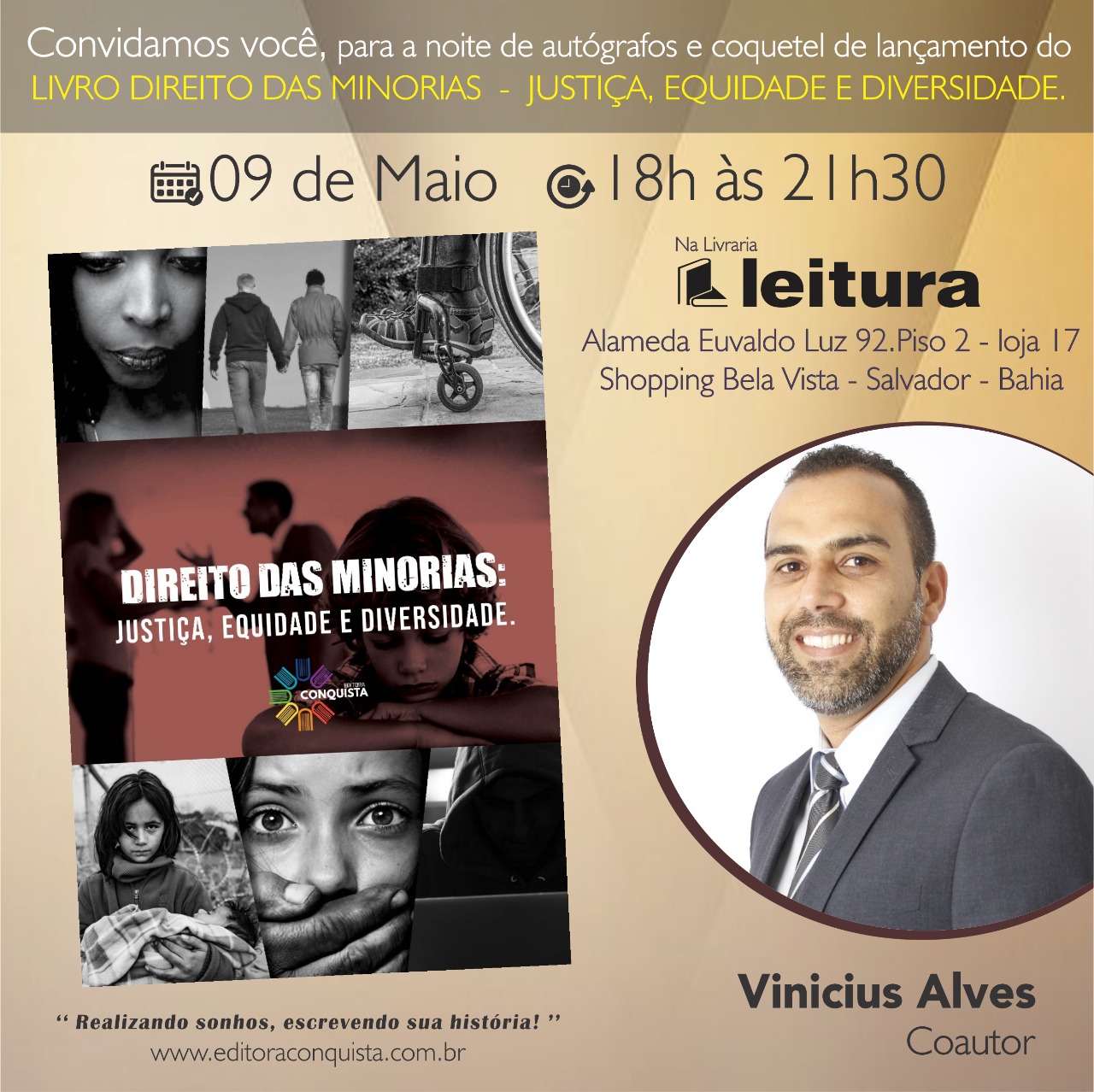 O livro "Direito das Minorias: Justiça, equidade e diversidade", pela editora Conquista e será lançado hoje, 9 de maio, em uma noite de autógrafos e coquetel na Livraria Leitura em Salvador.