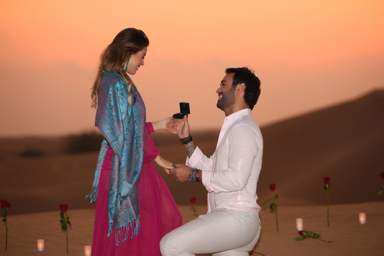 Du Nunes surpreendeu Mariana Bergo ao pedi-la em noivado no meio do deserto em Dubai, com direito a chefe de cozinha, drone e pedido privado