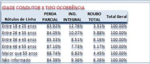 Indenização por faixa etária - Na análise por tipo de indenização (parcial e integral) por faixa etária, os jovens lideram as indenizações integrais dos veículos. Cerca de 12,8% das ocorrências com condutores entre 18 e 25 anos resultam em indenização total. O índice reduz de acordo com o avanço da idade. Por exemplo, os condutores de 26 e 35 anos ocupam a segunda posição com 10,1%; aqueles entre 36 e 45 representam 8,5% e os de 46 a 55 anos 7,7%. Com motoristas acima de 55 anos a indenização integral cai para 6,8%.