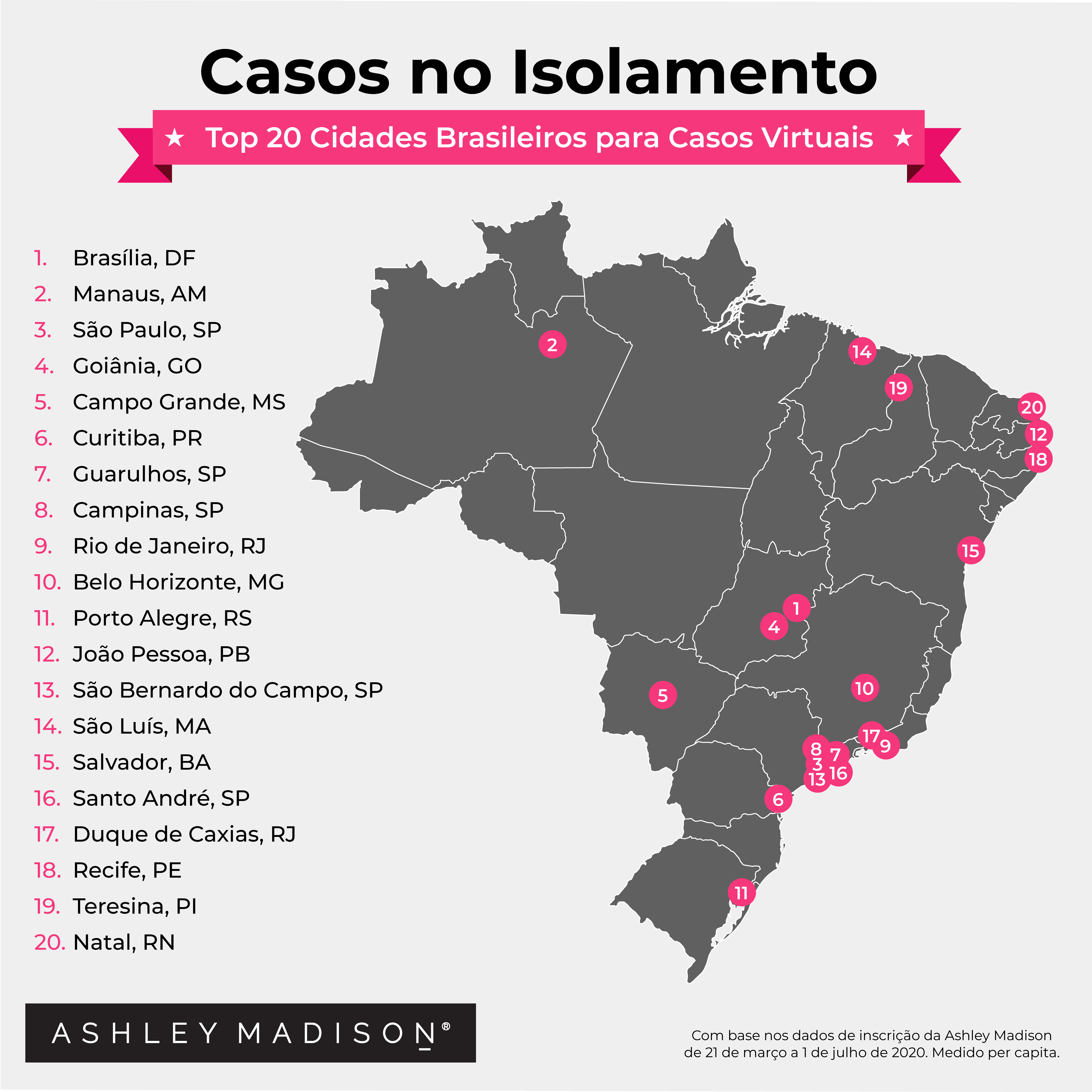 Esta lista das TOP 20 Cidades baseia-se em inscrições na Ashley Madison de 21 de março a 1 de julho de 2020 em uma base per capita. O estado de São Paulo, o estado mais rico e populoso do país, também é a região mais infiel, com cinco cidades na lista, incluindo São Paulo, Guarulhos e Campinas entre as 10 principais. Liderando o caminho como o primeiro lugar para trair durante a quarentena, no entanto, é a capital federal, Brasília. A capital é o centro da política do país, e a pressão nesta vertente aumentou de maneira compreensível nos últimos meses. Com a pressão vem a necessidade de lidar com ela, e muitos descobriram que a infidelidade é uma maneira eficaz de fazê-lo.