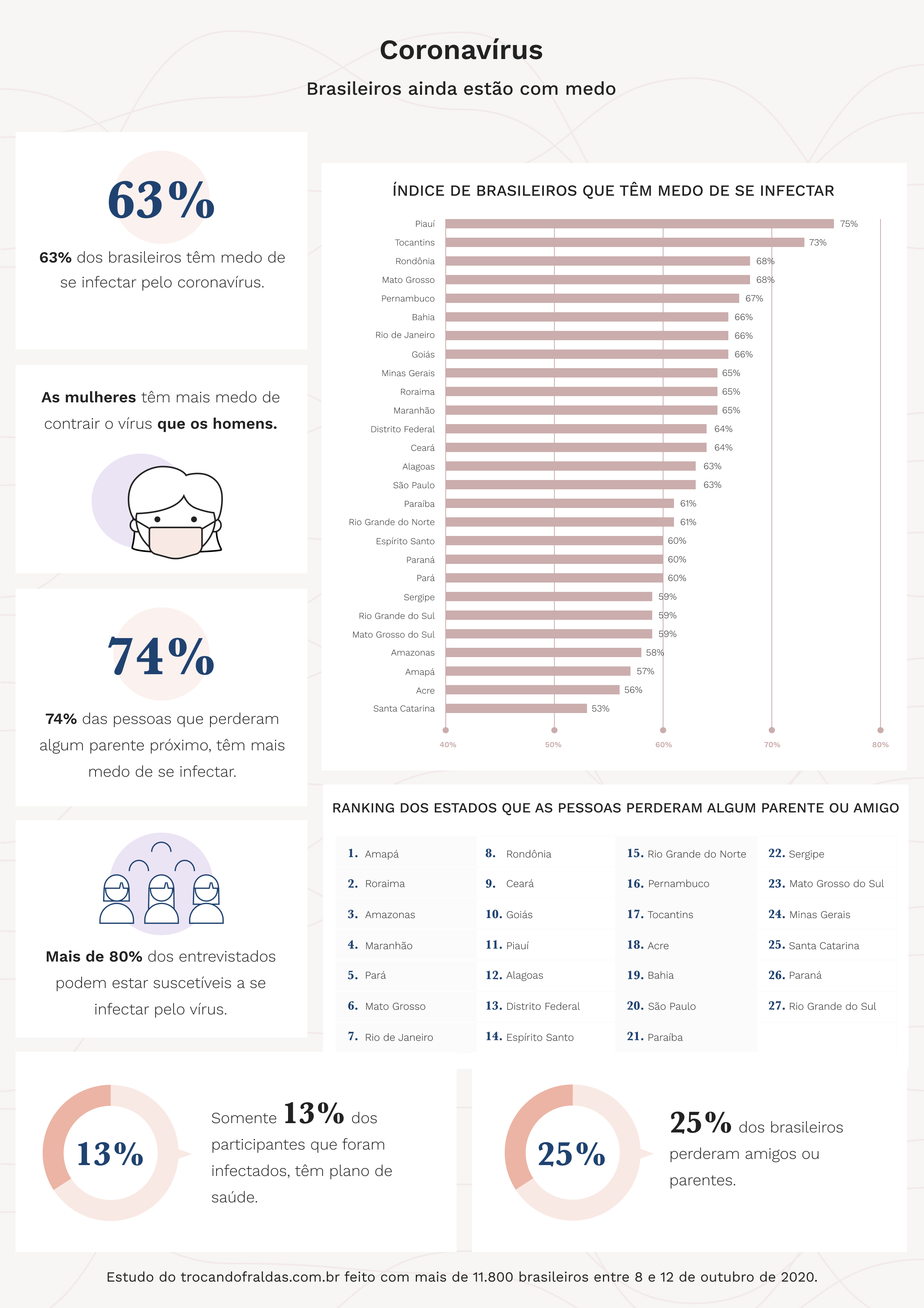 Ainda, o estado em que mais pessoas têm medo de se infectar é o Piauí, com 75% dos participantes. No Rio de Janeiro e em São Paulo, 66% e 63% têm medo, respectivamente. Logo no final da lista está o Acre, com 56% dos participantes com medo de contrair o vírus. Já o estado em que as pessoas têm menos medo de serem infectadas é Santa Catarina, com 53%.