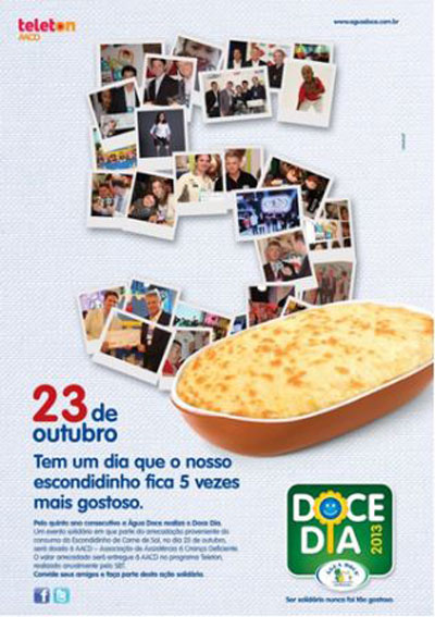 Este ato solidário é também delicioso. “Toda a verba arrecadada com a venda do prato mais apreciado da Água Doce, o Escondidinho, será revertida para a entidade”, explica o presidente da rede, Delfino Golfeto. “Até agora, já vendemos quase 50 mil Escondidinhos nas edições anteriores do Doce Dia. É uma campanha que muito nos orgulha”. A receita leva carne de sol desfiada, coberta por cremoso purê de mandioca gratinado com mussarela e requeijão. Vem acompanhada de arroz branco, pimenta e serve até três pessoas.