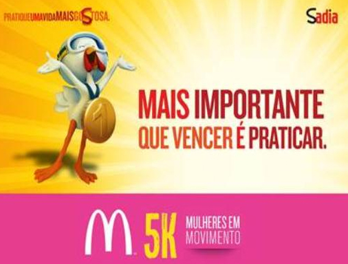 A Sadia, marca do portfolio da BRF conhecida por seu engajamento no meio esportivo e incentivo à atividade física, patrocina pelo segundo ano consecutivo a corrida de rua “McDonald’s 5K, Mulheres em Movimento” no Brasil. O evento acontecerá no dia 20 de outubro em São Paulo (SP), Curitiba (PR), Rio de Janeiro (RJ) e Brasília (DF) e em outras 15 cidades da América Latina, entre elas Buenos Aires (Argentina), Cidade do México (México) e Lima (Peru).
