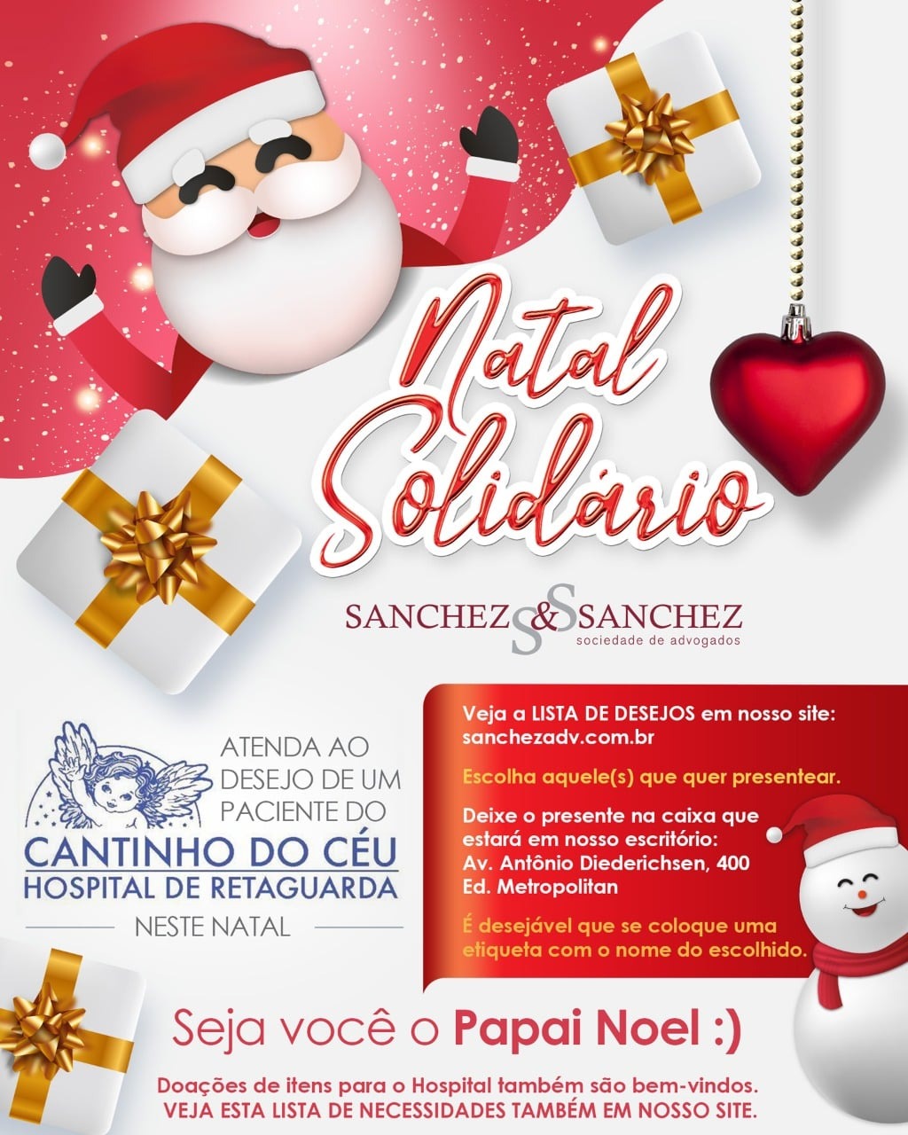 Que tal fazer algo diferente nesse Natal e ser você mesmo o Papai ou a Mamãe Noel? O Escritório Sanchez & Sanchez Sociedade de Advogados, de Ribeirão Preto, está promovendo uma campanha social para ajudar o Cantinho do Céu, Hospital de Retaguarda.