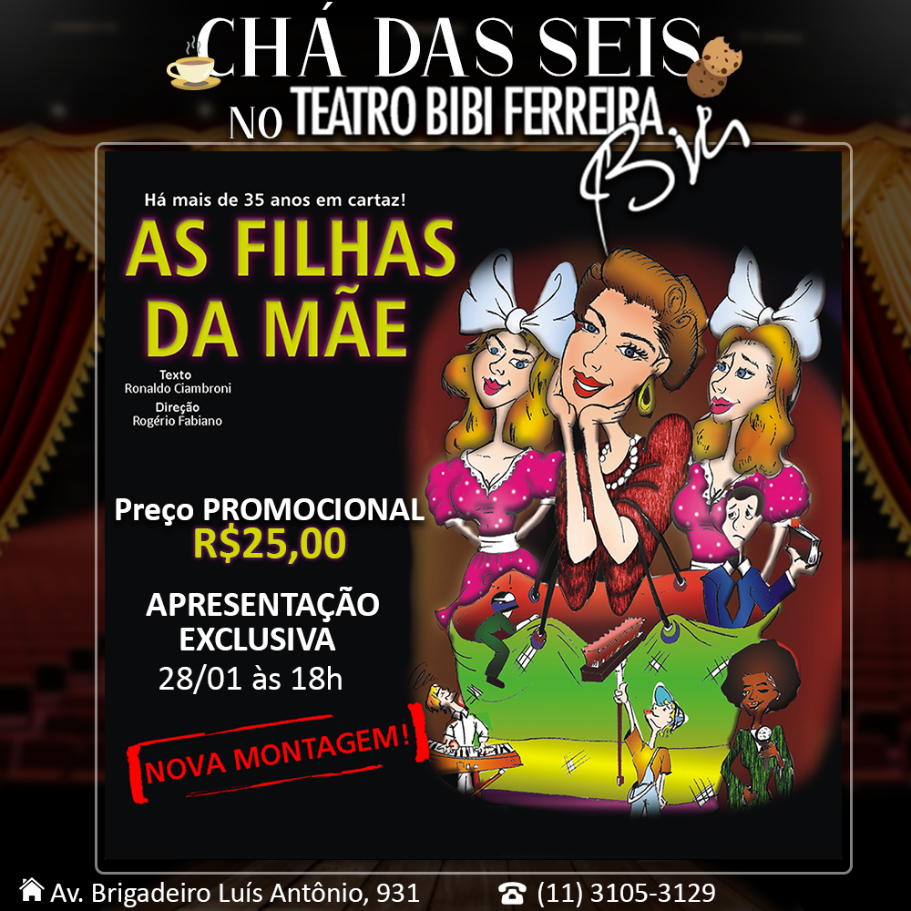 Serviços: Teatro Bibi Ferreira Av. Brigadeiro Luís Antônio, 931- Bela Visa, São Paulo/SP Informações: (11) 3105-3129 Valor: único de R$30,00