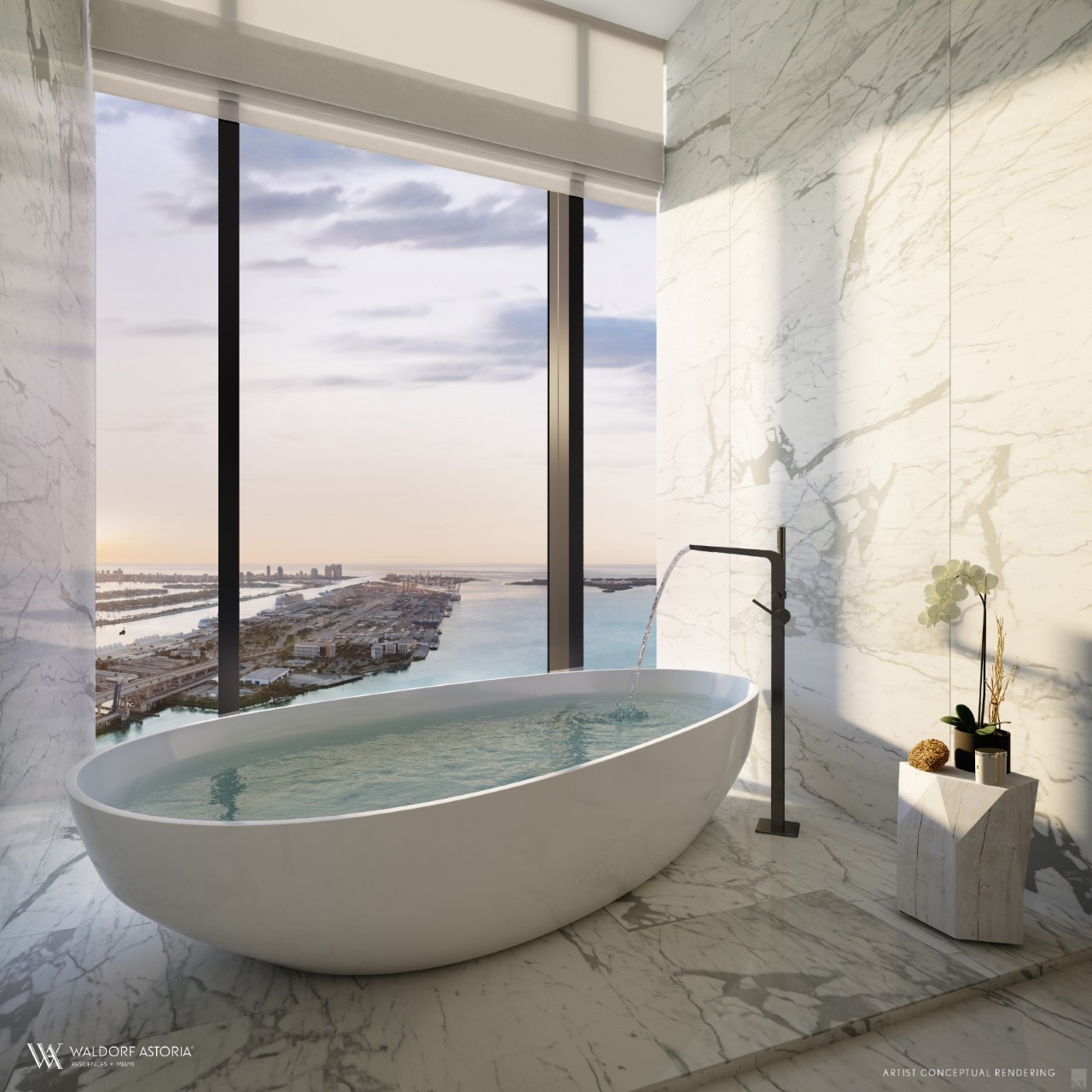 A grandiosa torre vai marcar o primeiro desenvolvimento do Waldorf Astoria no Sul da Flórida. O edifício com trezentos e sessenta apartamentos e duzentas e cinco suítes de hotel vai ter em suas dependências o lounge Peacock Alley, um restaurante exclusivo, espaços internos e externos para eventos, um deck na piscina estilo resort com cabanas, spa e academia. A torre foi projetada como uma pilha de nove cubos de vidro offset e o projeto ficou a cargo dos arquitetos Carlos Ott e Sieger Suarez.