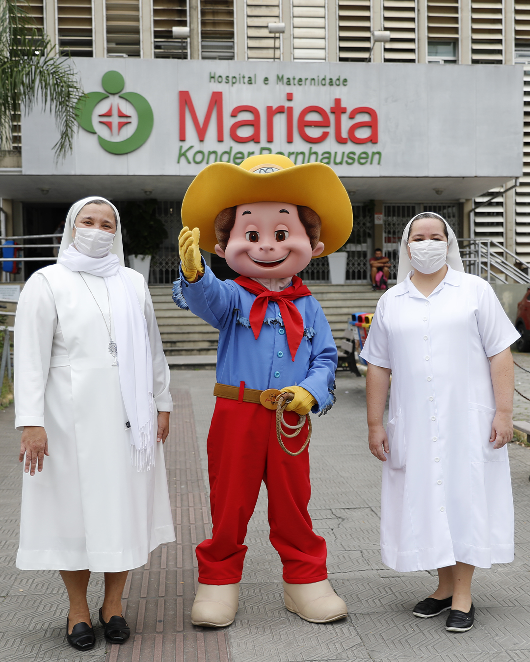 | Betinho Carrero com a Diretora Geral do Hospital Marieta, Ir. Mercia da Gloria Tiago Lemes e Ir. Gabriela Cristina Triervailer do setor de comunicação |