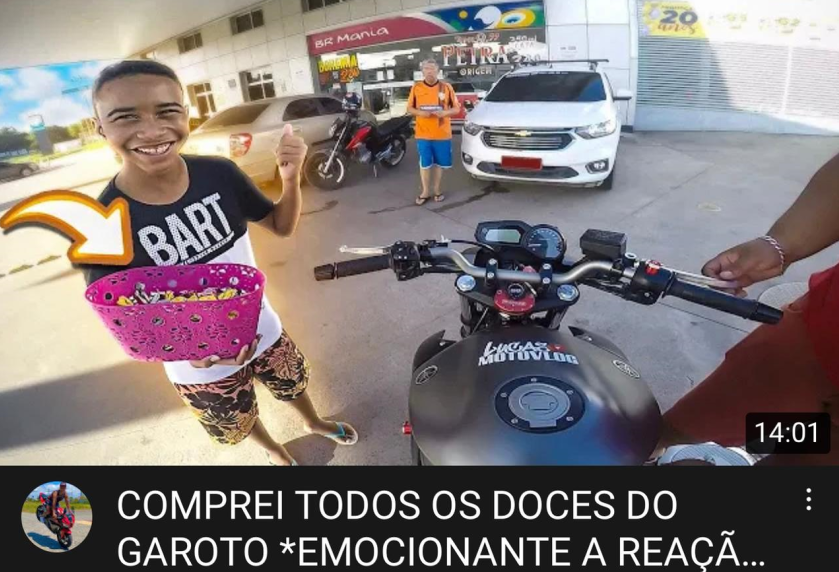 Imediatamente o motociclista e influencer teve uma ideia: comprar todos os doces e liberar o menino para voltar mais cedo para casa. E assim o fez! Lucas Motovlog pagou por todas as trufas e a reação do garoto foi emocionante: “a questão não é o valor em si, mas a ação! Quem tiver dois reais que seja, que ajude! Talvez possa parecer pouco para alguns, mas certamente para aqueles que estão ali de sol a sol faz toda a diferença”, finaliza.