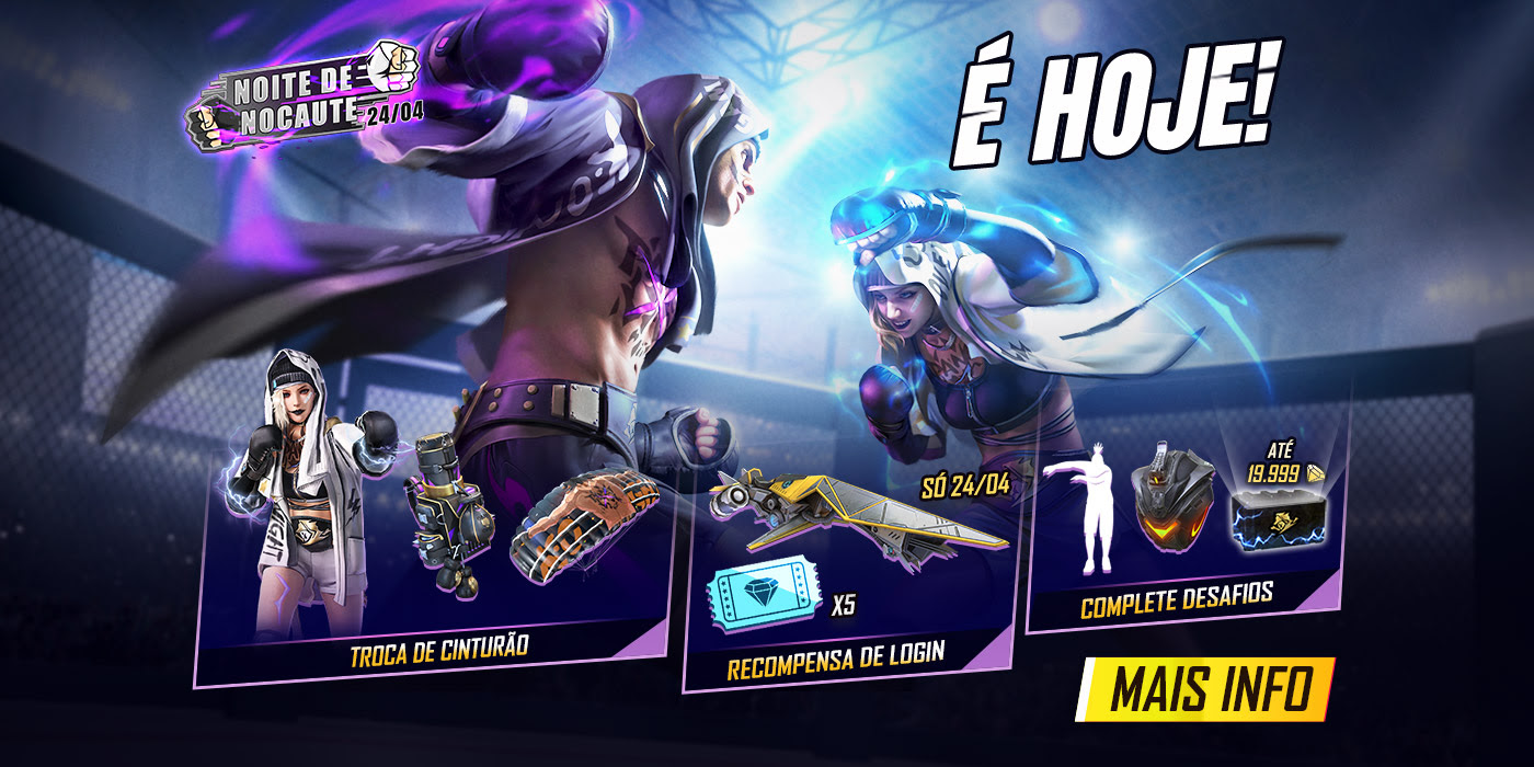 O evento Noite de Nocaute estará disponível este fim de semana no Free Fire, game mobile mais baixado do mundo em 2019 e em 2020, segundo relatório da App Annie. Os jogadores devem se preparar para a grande batalha que assumiu o controle do jogo na última atualização e ainda receber recompensas gratuitas.