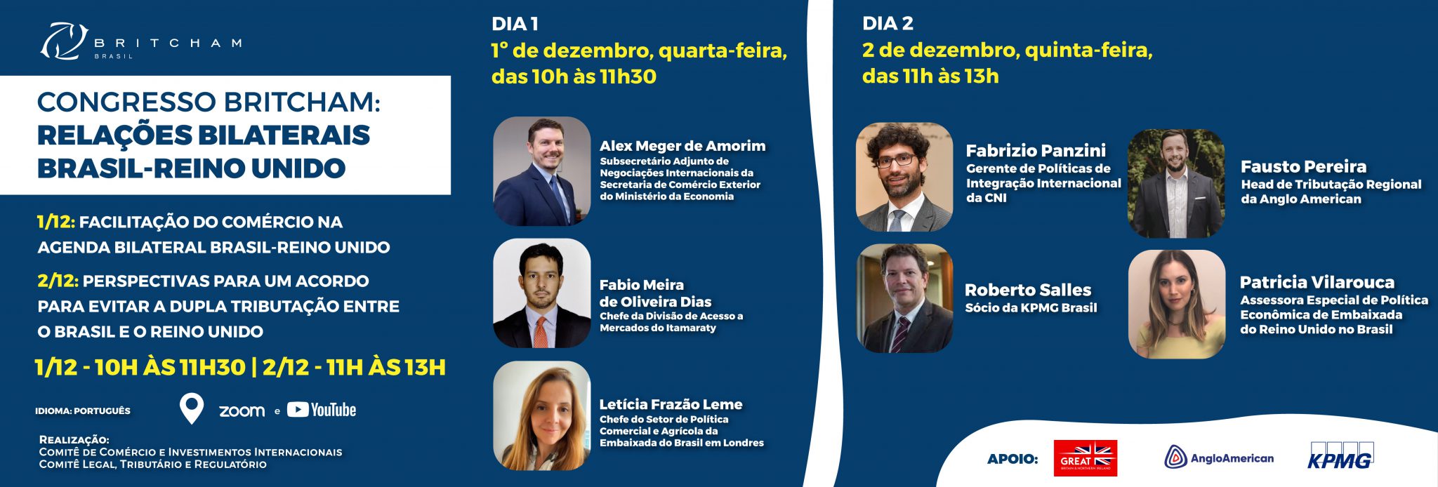Os convidados e palestrantes são especialistas nos temas e que vivem a prática no dia a dia. Serão dois de evento, online e gratuito, com muito conteúdo e troca de experiências para saber o que esperar da relação entre o Brasil e os países do Reino Unido em 2022.