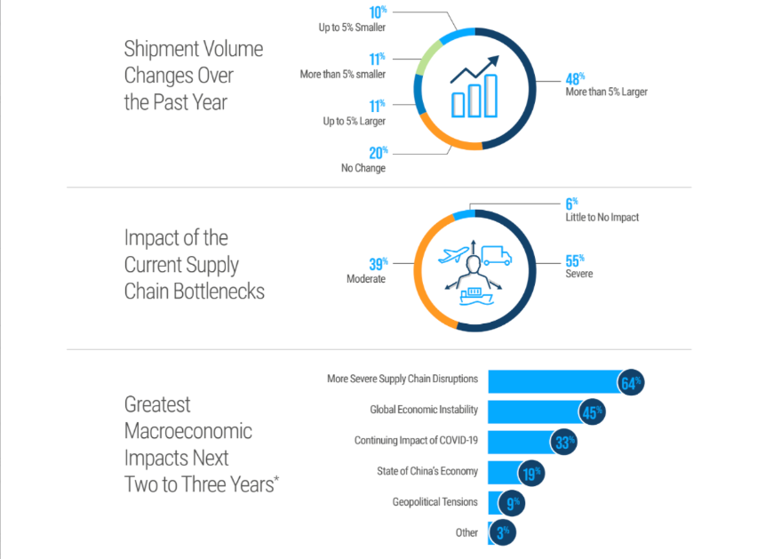 Efeitos do COVID – A pesquisa confirmou que a pandemia provocou uma crise da capacidade da cadeia de fornecimento em ampla escala. Particularmente, a maioria dos entrevistados acredita que os gargalos devem piorar nos próximos anos.