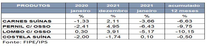 A cesta dos suínos teve deflação de 6,63% nos últimos 12 meses e quedas importantes no preço de alguns cortes em janeiro, como pernil (-6,43%) e lombo (-5,17%). Essa deve continuar a ser uma opção de proteína animal a bom preço para o consumidor durante todo o trimestre. Depois, segundo Diego Pereira, economista da APAS, os preços podem subir, “já que a Rússia elevou sua cota de importação de carnes suínas e um possível posicionamento de aquisição de carnes brasileiras poderá alterar os valores no mercado interno", explica.