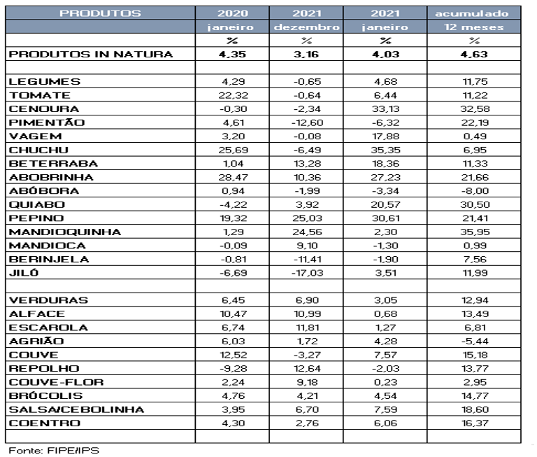 Dentre os hortifrutigranjeiros (produtos in natura), o IPS geral registrado em janeiro aumentou 4,03% e 4,63% nos últimos 12 meses, principalmente por conta da alta dos legumes e verduras, que inflacionaram 12,21 % e 3,05% em janeiro, respectivamente.
