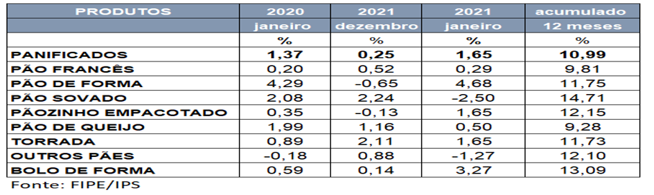 A cesta dos industrializados apresentou inflação puxada pela alta dos produtos derivados do trigo. Os itens panificados, com inflação de 1,65% em janeiro e de 10,99 % nos últimos 12 meses, pesaram no índice da categoria. O trigo utilizado na fabricação é importado, fator que afeta a cadeia produtiva com os efeitos da variação cambial. Mesmo com as estimativas da Conab (Companhia Nacional de Abastecimento) de uma produção de trigo 23,20% maior em relação à safra passada e da elevação de 17,00% na área cultivada, a tendência é de alta nos preços para os próximos meses.