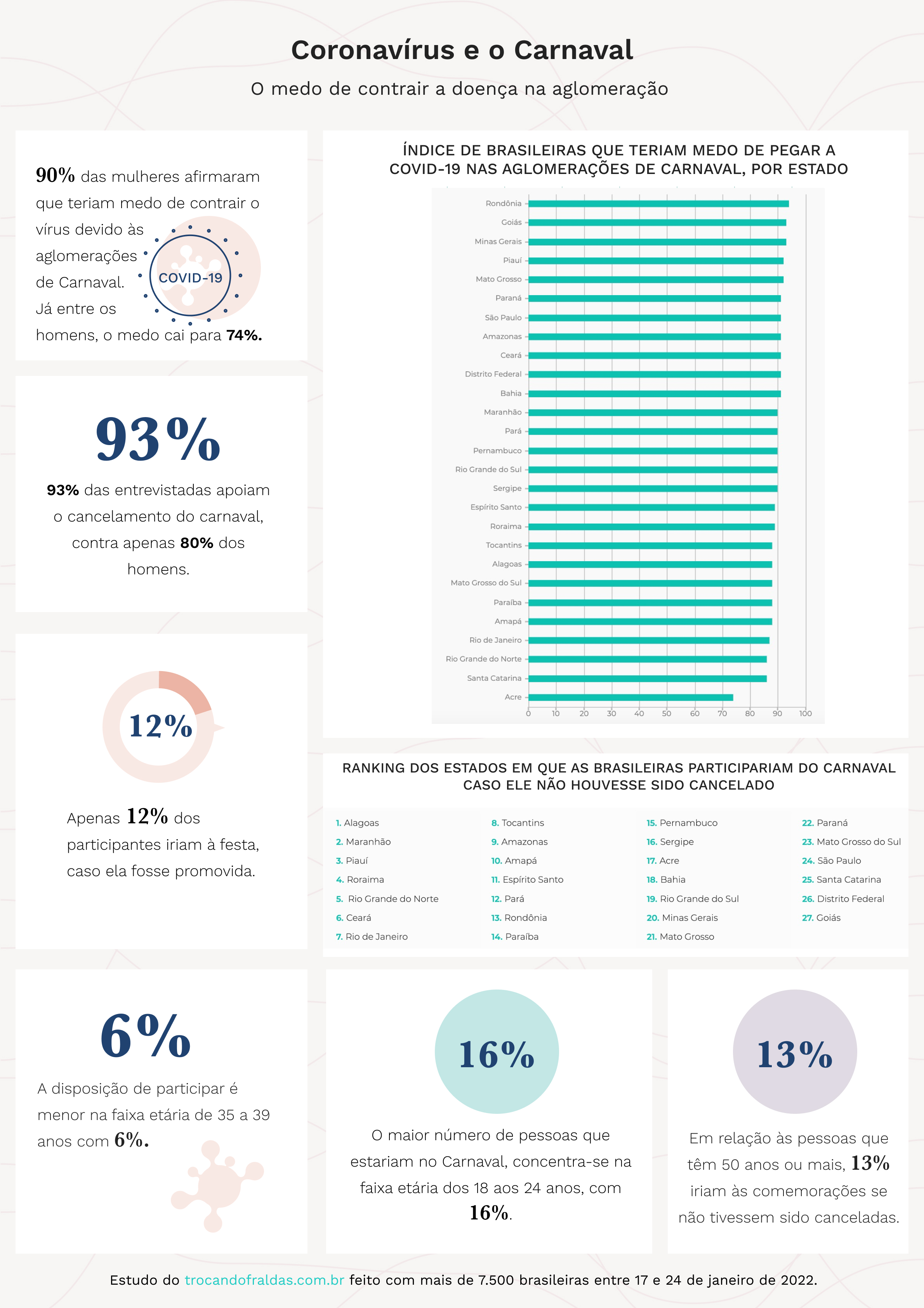 Ainda, somente 12% das respondentes iriam a festa, caso ela fosse realizada. Principalmente as mulheres dos 18 aos 24 anos, com 16% delas. E dos 35 aos 39 anos, com 15% das participantes. Já nos estados, Alagoas é o estado em que mais respondentes participariam da festa, com 20% das participantes. No Rio de Janeiro e no Espírito Santo, pelo menos 14% iriam. E em São Paulo e no Distrito Federal, pelo menos 7% das participantes.