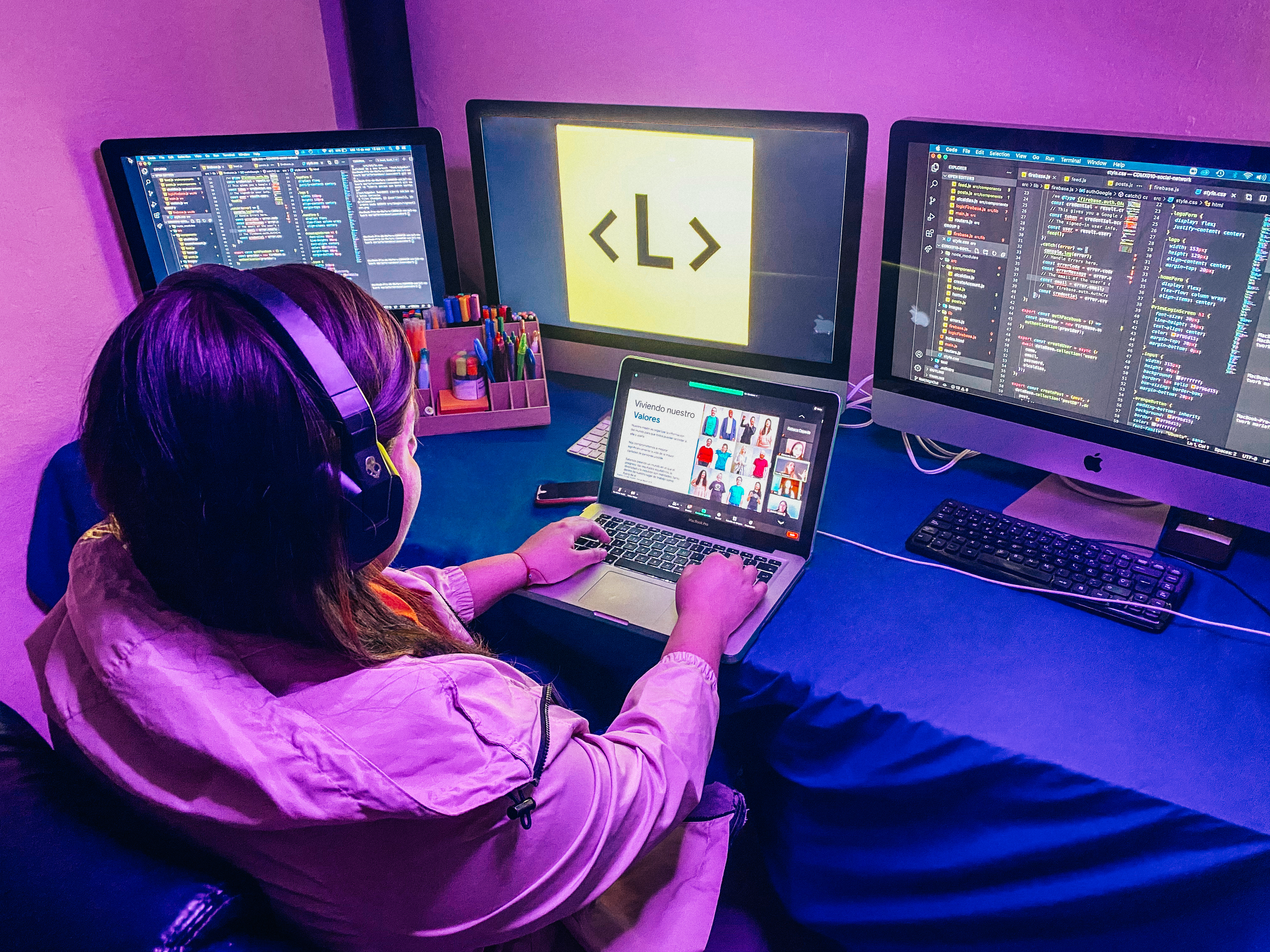 | Fernanda Solis, aluna da Laboratória, programando durante o bootcamp remoto |