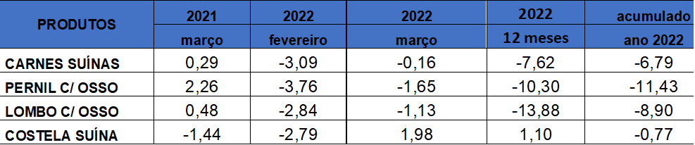 Os cortes suínos, na contramão das demais proteínas animais, apresentaram deflação (7,62%) pelo 12º mês seguido, beneficiados principalmente pelo aumento de produção (4,86%) em relação ao mesmo período de 2021. A tendência, segundo Diego Pereira, é de queda no primeiro semestre. “A guerra dificultou a exportação da nossa carne suína para a Rússia. Por isso, a oferta no mercado interno deverá continuar alta”, avalia o economista.