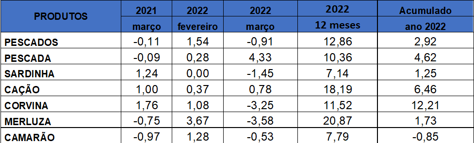 Os pescados foram impactados diretamente pelo aumento dos preços dos combustíveis para pesca selvagem e da ração para a piscicultura. Mesmo assim, essa cesta apresentou queda de 0,91% em março, apesar de aumentos pontuais, como a da pescada (4,33%). O setor enxerga com otimismo a venda de pescados nesta Páscoa. “A volta aos encontros presenciais incentiva as famílias a comemorar a data”, analisa Pereira.