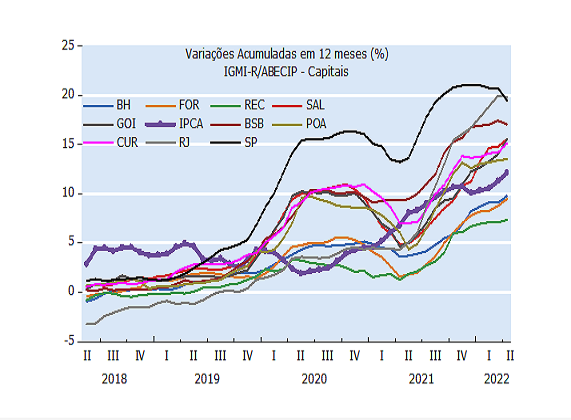 Em termos das dez capitais analisadas pelo IGMI-R/ABECIP, São Paulo, Rio de Janeiro e Brasília compõem o grupo com as maiores variações acumuladas em doze meses, porém com desaceleração em relação aos respectivos resultados de março. Goiânia, Salvador, Curitiba e Porto Alegre integram um segundo grupo com variações acumuladas em 12 meses inferiores às do primeiro grupo, porém com aceleração em abril, e ainda registrando ganhos reais. Um terceiro grupo, formado por Belo Horizonte, Fortaleza e Recife, também apresenta aceleração nas taxas de variação acumuladas em 12 meses, porém ainda aquém da variação acumulada em 12 meses pelo IPCA/IBGE.