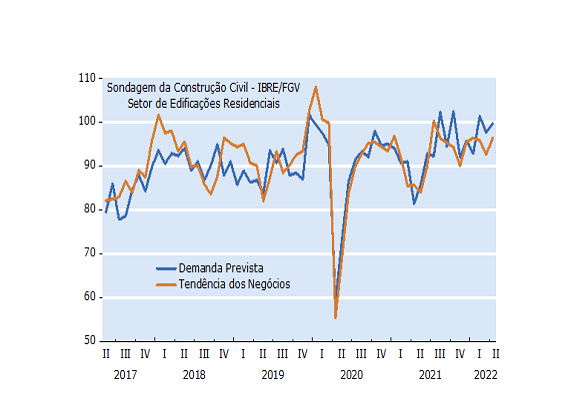 A aceleração dos preços dos imóveis residenciais a partir do segundo trimestre de 2021 ocorreu no contexto da retomada do nível de atividades da economia brasileira, e do aumento da concessão de crédito para o setor. Apesar da tendência de acomodação do crescimento desses preços verificada em abril, e dos desafios renovados em relação à evolução dos preços ao consumidor, as expectativas dos empresários do setor ainda mostram resiliência. Dois dos principais componentes do Índice de Expectativas da Sondagem da construção civil IBRE/FGV, Demanda Prevista e Tendência dos Negócios, reverteram em abril o movimento de queda verificado no mês anterior, como pode ser visto no gráfico abaixo.