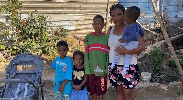 | Célia mora com os seis filhos; Miguel (de camisa verde) ligou para a PM | Foto: Kiuane Rodrigues/Record TV Minas |