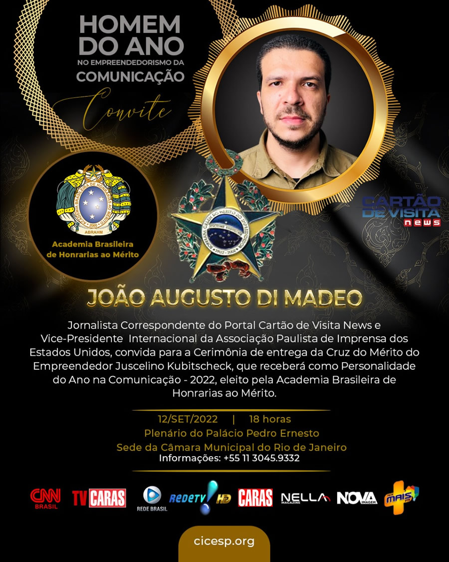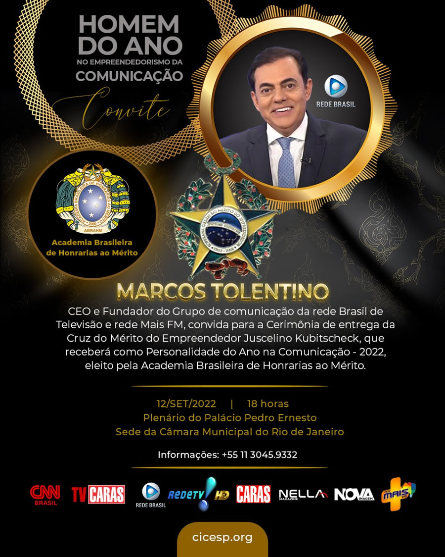 A Honraria de Cruz ao Mérito do Empreendedor Juscelino Kubitschek, que já foi entregue à diversos grandes nomes do Brasil, dentre eles, Fernanda Monte Negro, Arlindo Cruz e Zico, hoje será entregue pelo Comendador Regino Barros aos destaques do ano. Entre os homenageados da noite estão a dupla César Menotti e Fabiano, o ator e cantor Arthur Aguiar, o empresário e CEO do Nella Airlines Group Mauricio Souza, o CEO e fundador do Grupo de Comunicação da Rede Brasil de Televisão e Rede Mais FM, Marcos Tolentino e o jornalista correspondente do Cartão de Visita News e Vice-Presidente da API nos Estados Unidos, João Augusto Di Madeo.