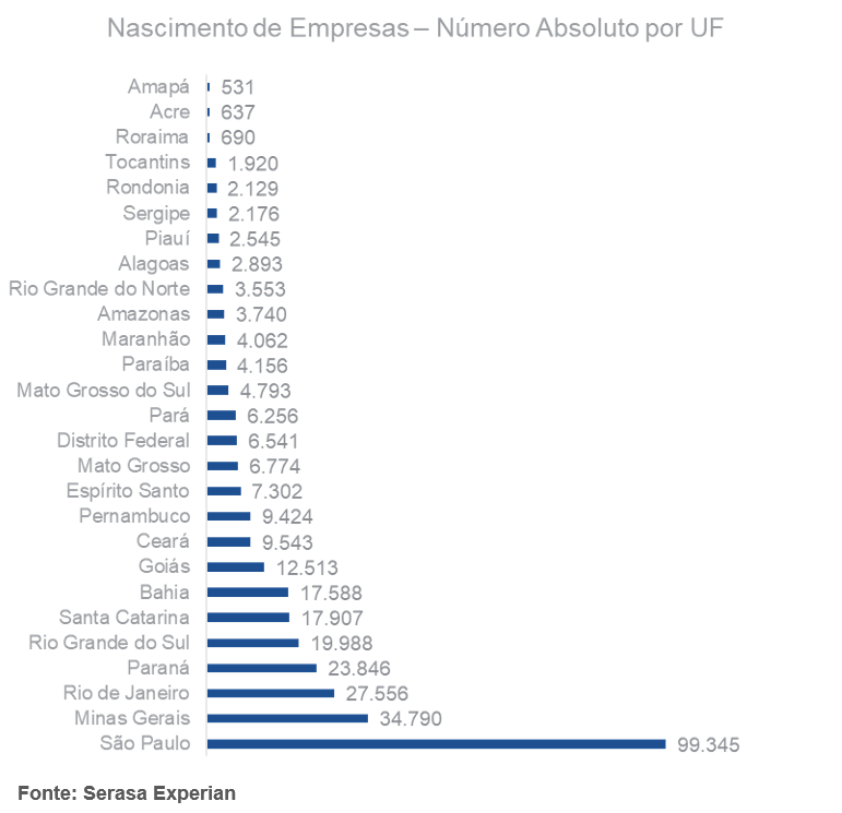 Na distribuição do nascimento de empresas brasileiras por unidade federativa é possível observar que a maior parte dos novos negócios pertencem ao Estado de São Paulo (99.345). Em sequência estão: Minas Gerais (34.790), Rio de Janeiro (27.556), Paraná (23.846) e Rio Grande do Sul (19.988). Veja a seguir o gráfico com a distribuição por UF na íntegra:
