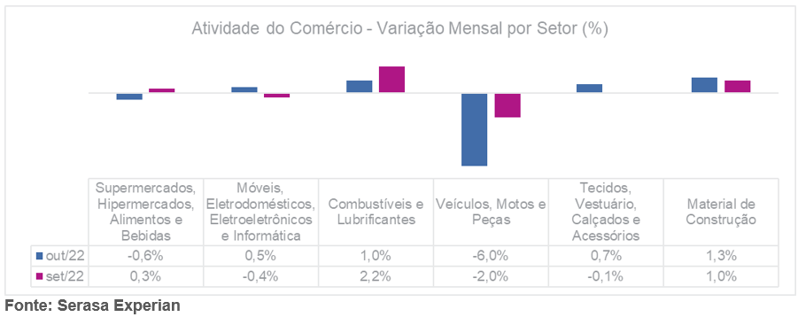 Para o economista da Serasa Experian, Luiz Rabi, apesar da melhora no cenário econômico brasileiro, algumas variáveis têm direção contrária. “A queda de outubro mostra que mesmo com a baixa da inflação, que acarreta a recuperação do poder de compra dos consumidores, a contínua alta da taxa Selic impacta setores que têm os financiamentos como principal ferramenta de compra, por exemplo, o segmento de Veículos, Motos e Peças, que apresentou a maior queda do mês, influenciando a retração geral do índice”.