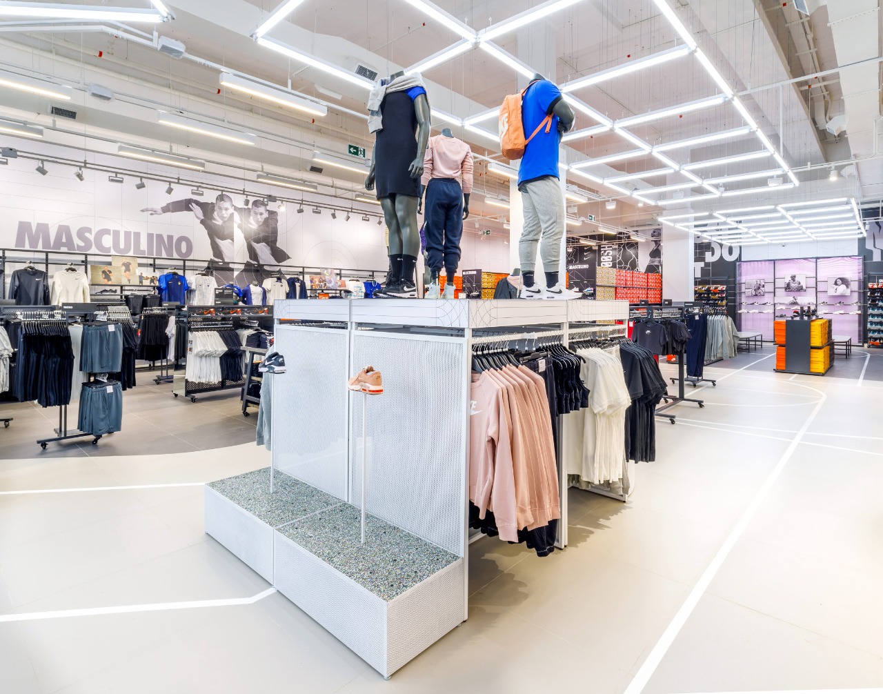 Com mais de 700m², a nova loja tem em sua identidade o desejo de pertencer à comunidade. Sendo assim, é possível encontrar na decoração do espaço elementos da região agregados a comunicação visual, como fotografias locais, grafismo do mapa da região, coordenada geográfica da loja e logotipo único. Nas paredes, imagens de modelos com corpos reais complementam o ambiente industrial da Nike Unite SP Market.