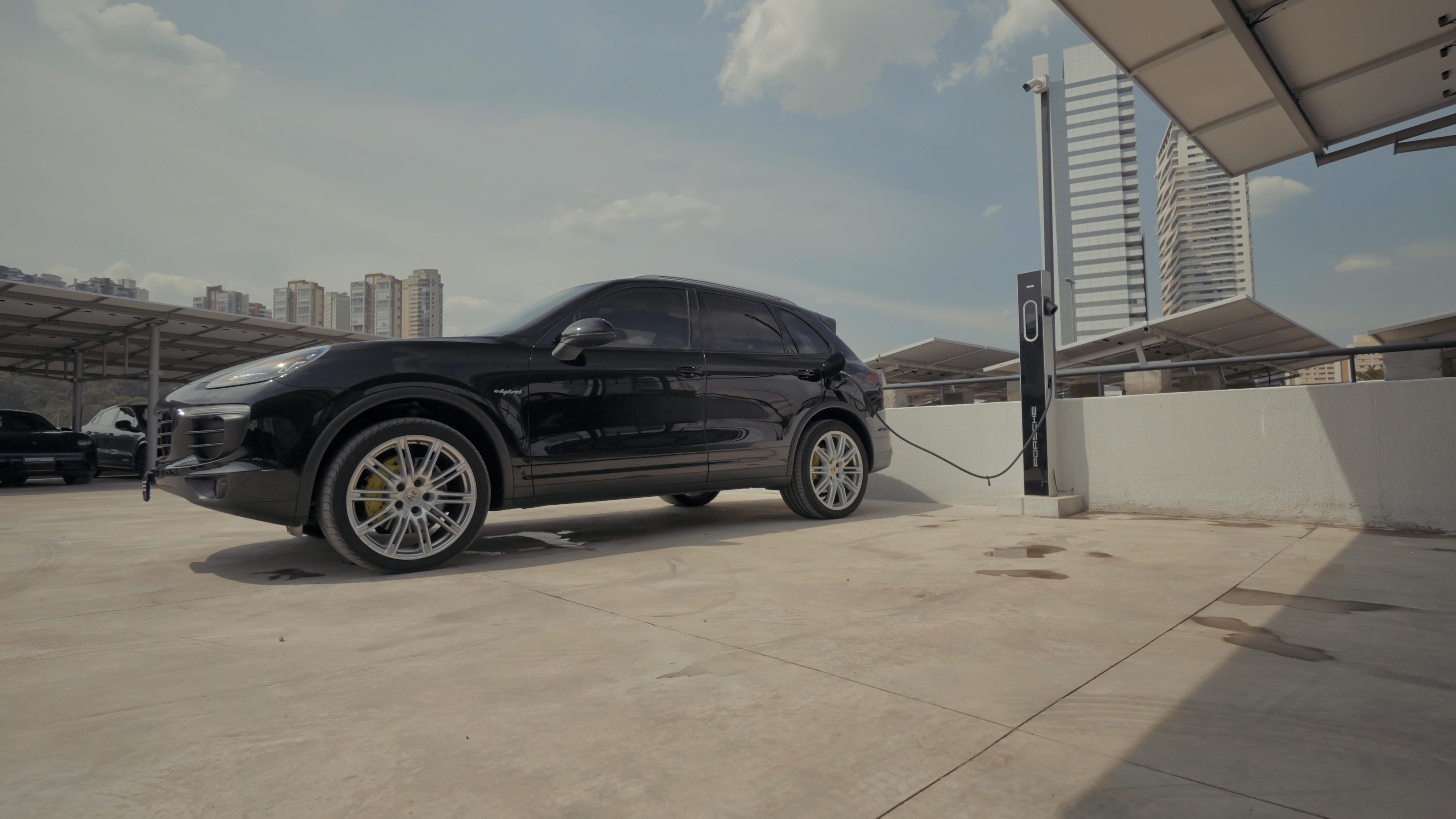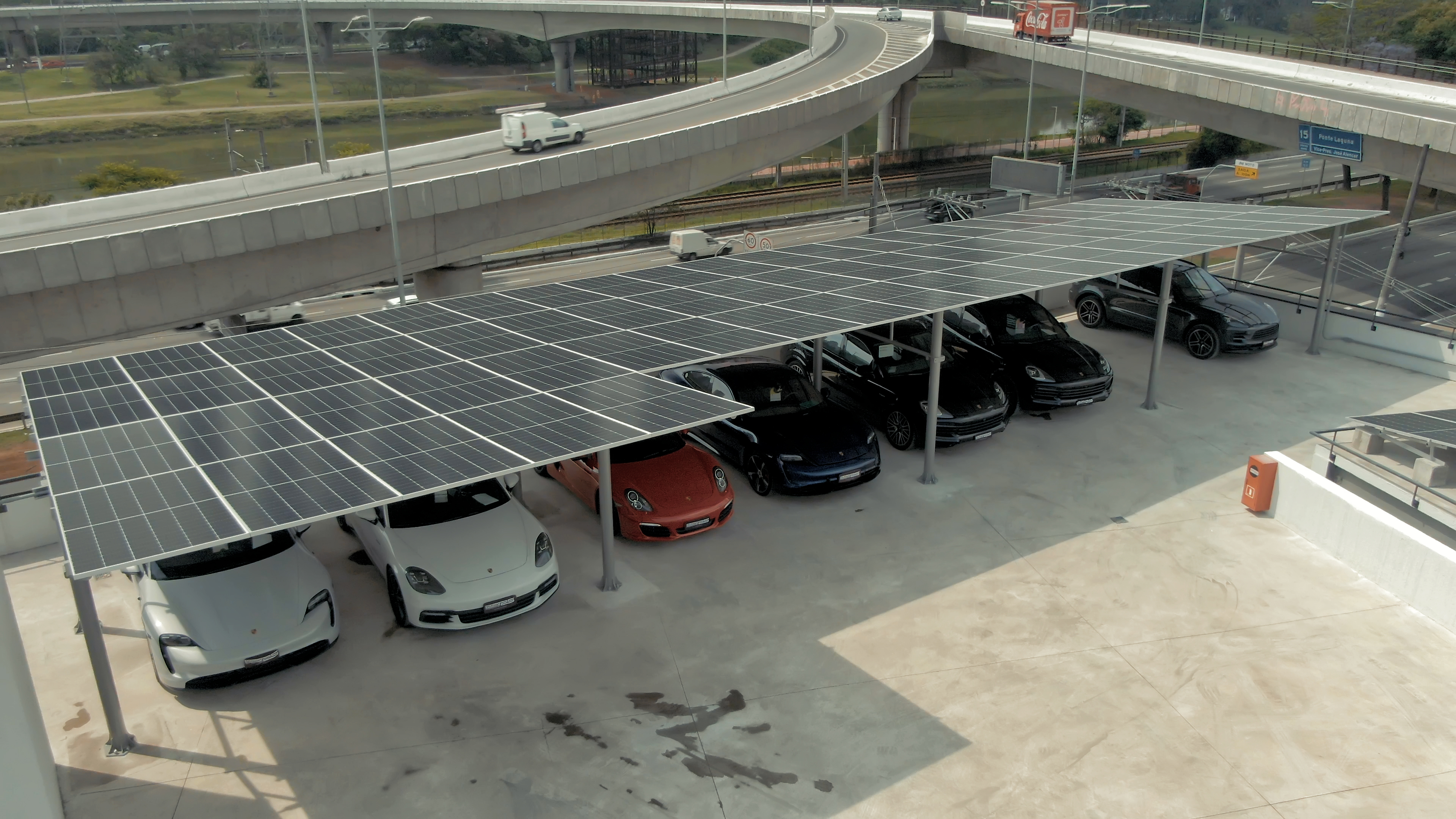 Com a instalação dos painéis solares, cerca de 600 m² da área de estacionamento passaram a ser cobertos com uma estrutura que, além de proteger os carros, gera parte da energia consumida no prédio. O sistema também abastece os dois carregadores ultrarrápidos (350 kW, capazes de carregar 100% da bateria de um carro elétrico como o Porsche Taycan em 22 minutos e 30 segundos) e os 14 carregadores de 22 kW instalados na unidade.