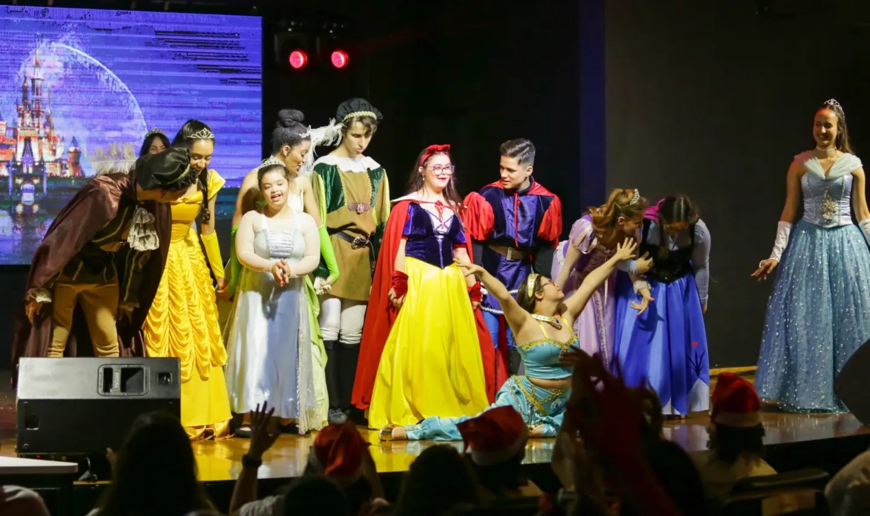 VÁRIAS MENINAS EM CIMA DO PALCO, CADA UMA REPRESENTANDO UMA PRINCESA DA DISNEY E TRÊS MENINOS VESTIDOS DE PRÍNCIPES. FIM DA DESCRIÇÃO. |