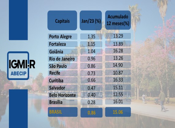 A variação mensal do IGMI-R/ABECIP voltou a desacelerar no primeiro mês de 2023, registrando 0,86% (ante 1,05% no mês anterior), enquanto o resultado acumulado em 12 meses ficou idêntico ao de dezembro de 2023 (15,06%). Entre as dez capitais analisadas pelo índice, São Paulo, Rio de Janeiro, Curitiba e Belo Horizonte apresentaram resultados muito próximos aos registrados no mês anterior, tanto em termos da variação mensal quanto da acumulada em 12 meses.