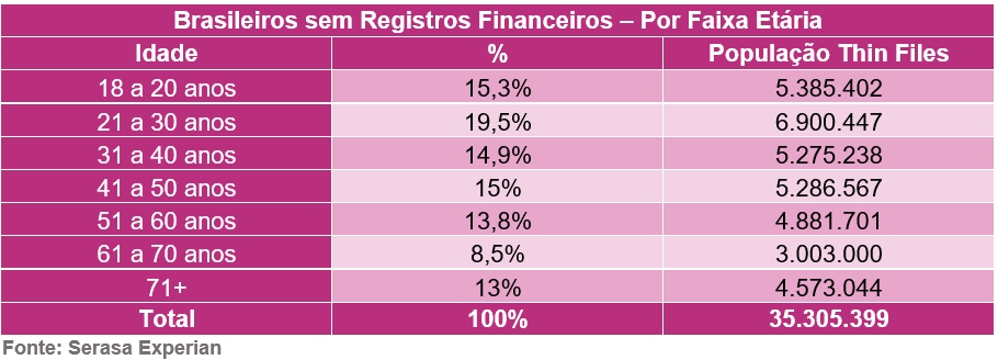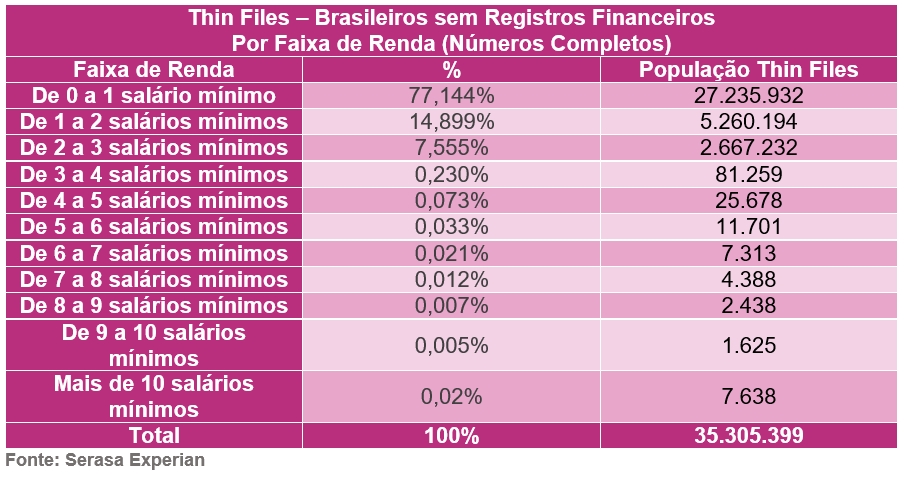 Um estudo inédito da Serasa Experian identificou 35,3 milhões de brasileiros sem registros financeiros, isto é, 21,7% da população adulta do país não possui contas de consumo, financiamentos, empréstimos ou faturas de cartão de crédito registrados em seu CPF, nem mesmo estão no Cadastro Positivo. Também chamados de “Thin Files” ou literalmente “pessoas sem informação de crédito”, geralmente são indivíduos que não usam o crédito regularmente e, portanto, não têm nenhuma atividade recente em seu histórico, bem como jovens que ainda não iniciaram sua vida financeira e não possuem encargos.