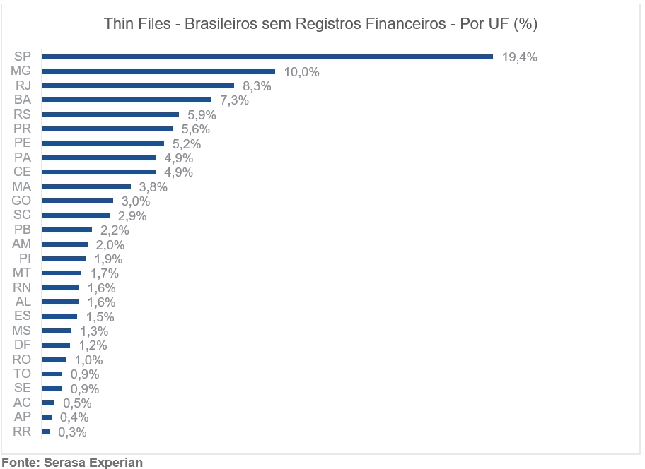 Os estados de São Paulo (19,4%), Minas Gerais (10%) e Rio de Janeiro (8,3%) lideraram o ranking com a maior participação de Thin Files, ou pessoas sem registros financeiros. Os estados do Acre (0,5%), Amapá (0,4%) e Roraima (0,3%) tiveram a menor participação. A seguir, veja o levantamento completo por Unidades Federativas (UFs):