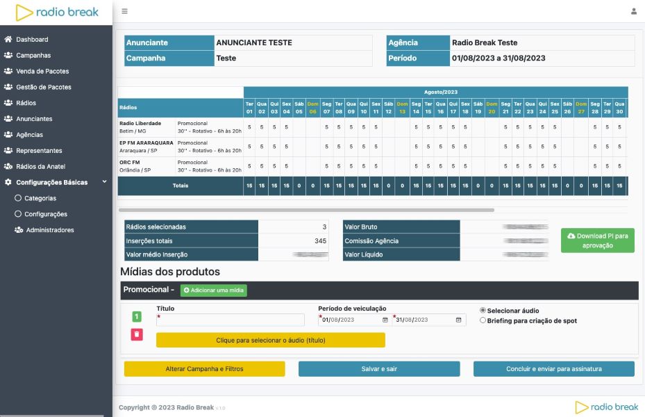 Otimização do processo de compra e venda: Com a Radio Break, é possível agilizar o processo de compra e venda de mídia em rádio, eliminando burocracias e trabalhos operacionais desnecessários pois a plataforma utiliza tecnologias de assinatura digital para autorização das campanhas e cria e dispara o plano de mídia e pedidos de inserção para os envolvidos.