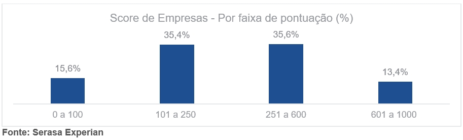 Na média nacional, que reúne os dados de todas as Unidades Federativas (UFs), o levantamento mostrou que 35,6% das empresas no Brasil têm pontuação entre 251 e 600 e 35,4% entre 101 e 250 pontos. Veja, no gráfico abaixo, o levantamento detalhado: